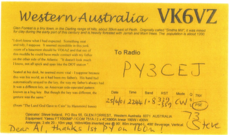 Cartăo QSL do contato entre Alencar Fossa PY3CEJ e VK6HD da zona 29, Austrália: